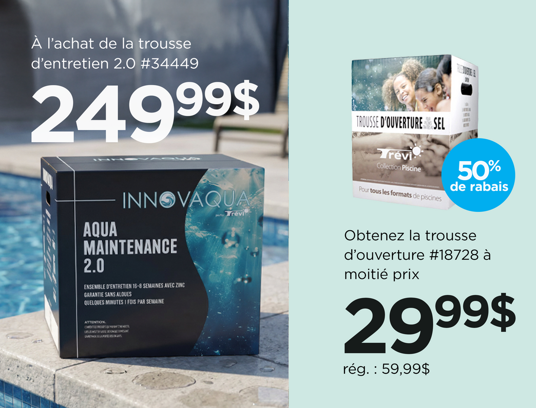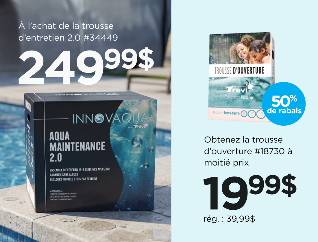 Obtenez votre trousse d'ouverture au chlore pour seulement 19,99 $ à l'achat de la trousse d'entretien 2.0. Faites vite, la saison approche !