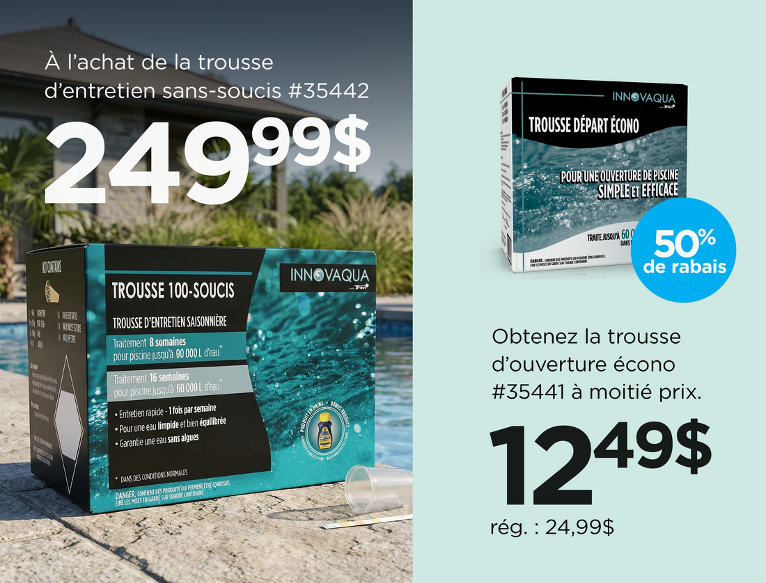 Obtenez votre trousse d'ouverture Écono à seulement 12,49 $ à l'achat de la trousse d'entretien Sans-Soucis. Préparez votre piscine dès maintenant !