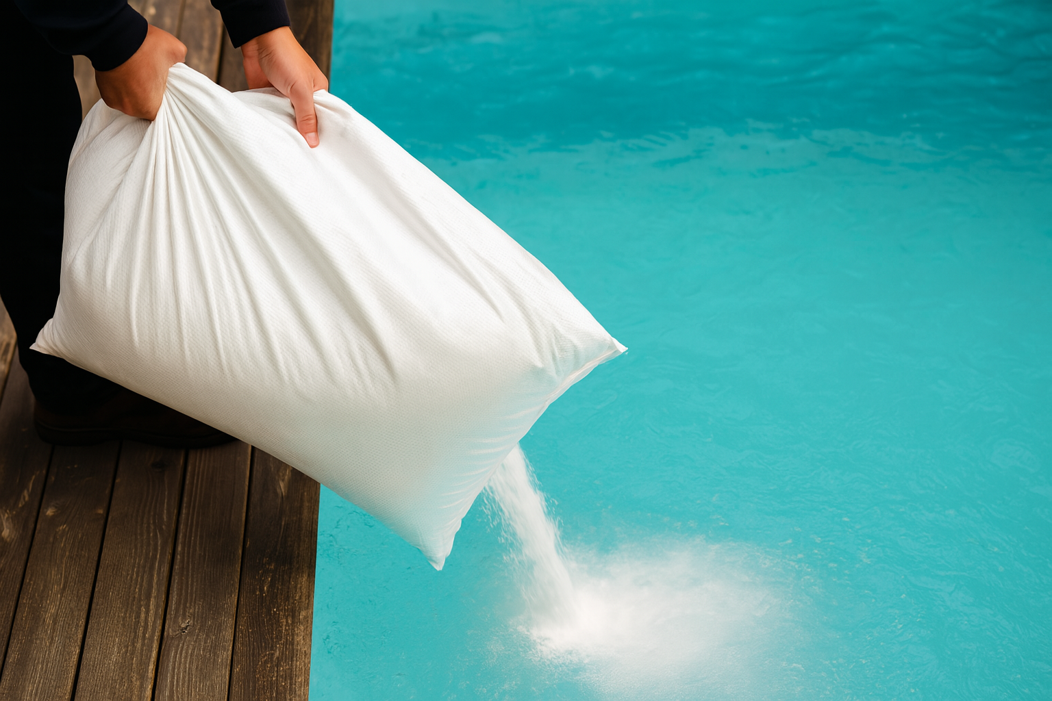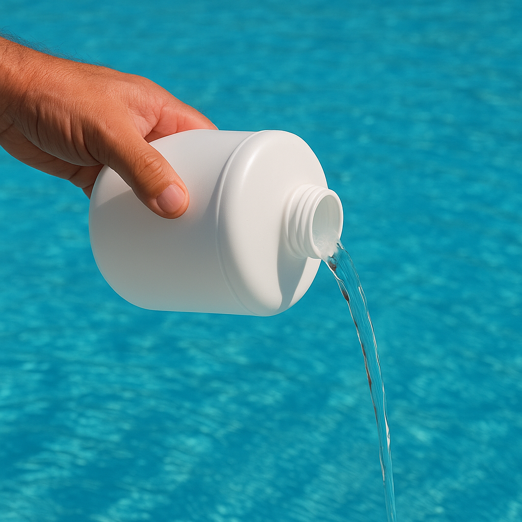 Fonctionnement : Le chlore liquide (hypochlorite de sodium) est versé directement dans la piscine et se dissout pour désinfecter l'eau.
