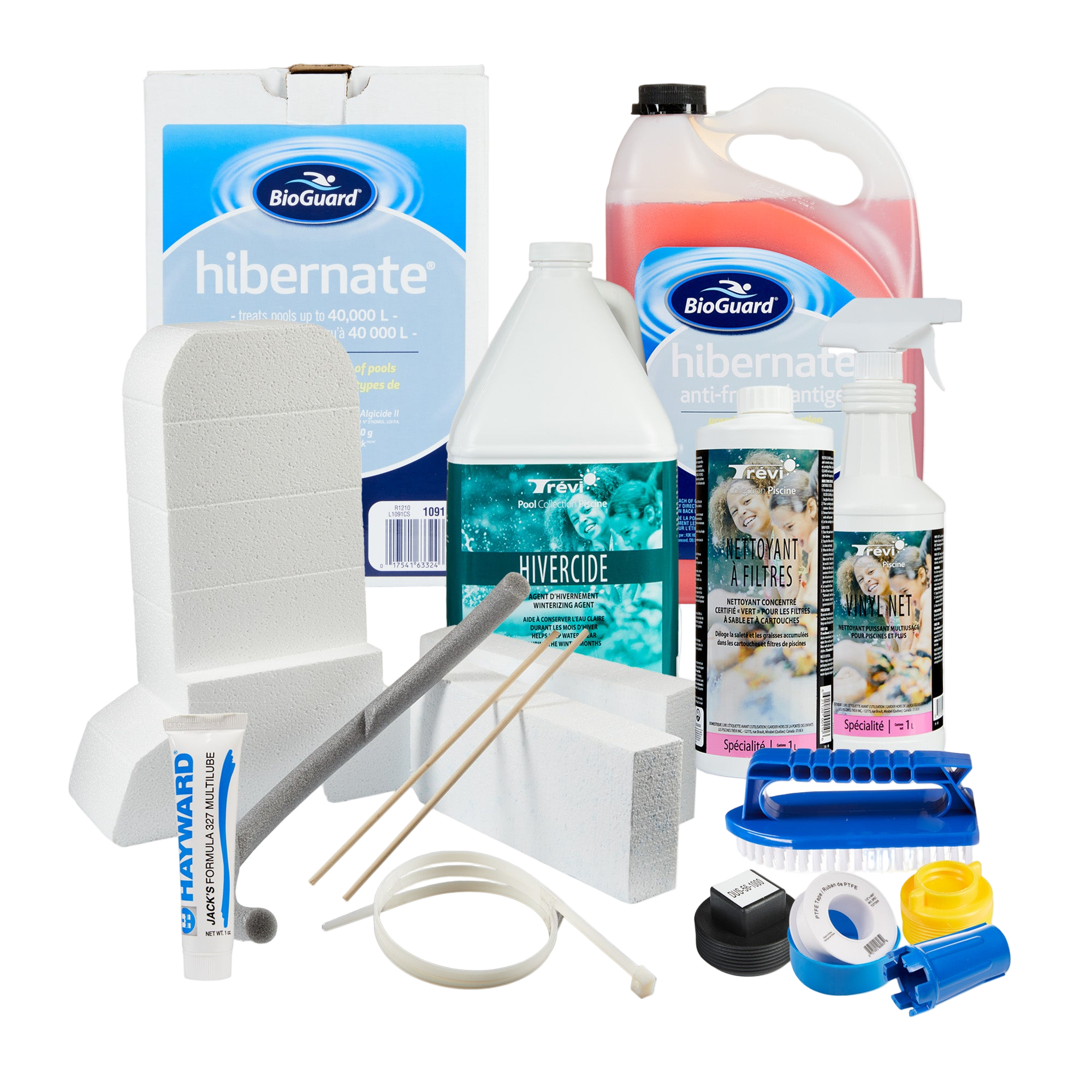 - Ensemble de fermeture : produits chimiques + items d’hivernisation (bouchons, protection pour l'écumoire, boudin, etc.).