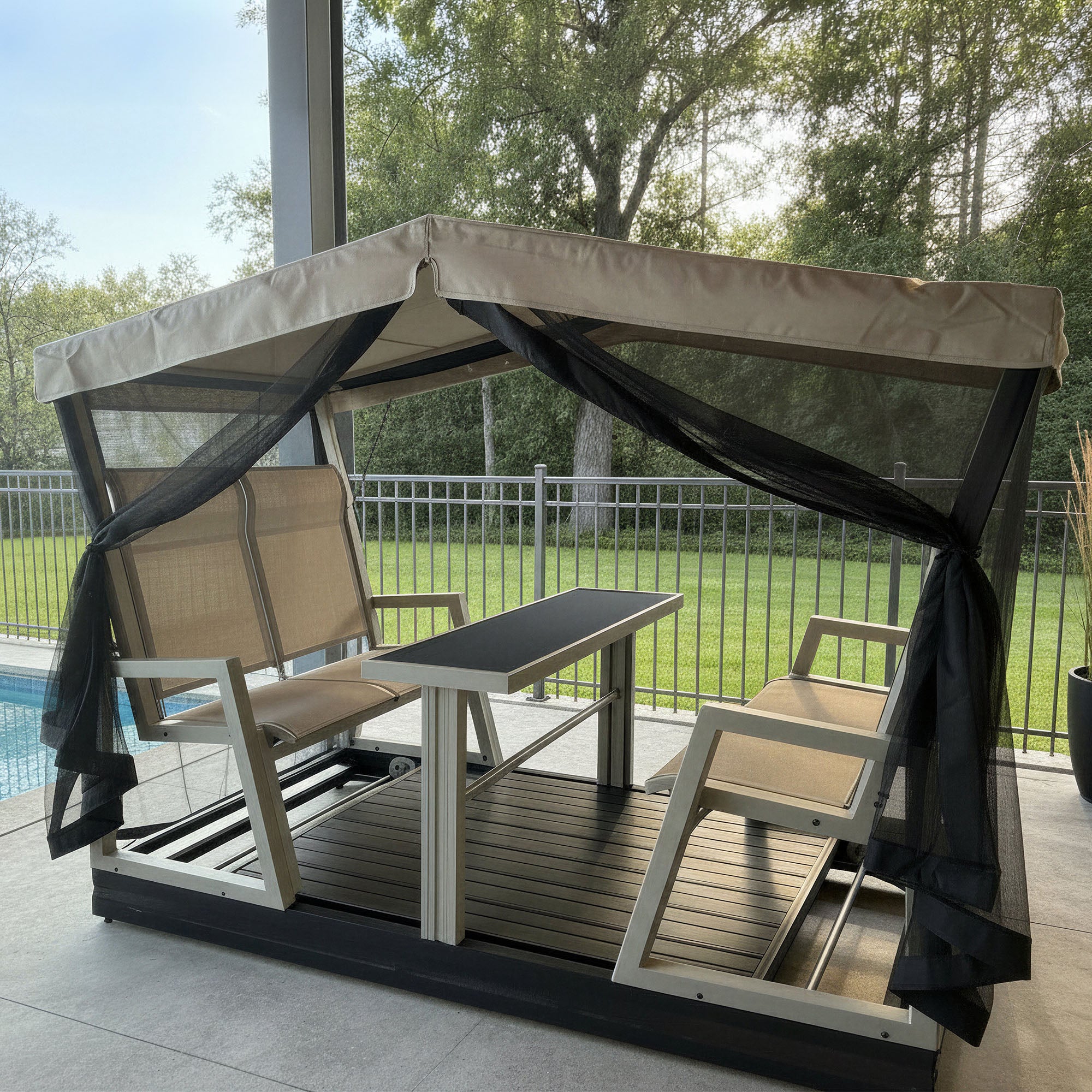 Add style and comfort to your backyard with our 4-seater swing on wheels, perfect for sharing relaxing moments with family and friends. Its elegant design and sturdy construction provide a smooth and user-friendly swinging experience that will be a hit all summer long.