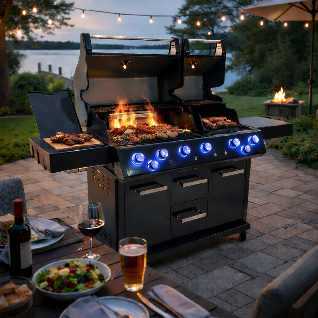 Cooking grids: multifunctional cast iron, removable center for optional accessories: cast iron pot, frying pan, pizza stone.