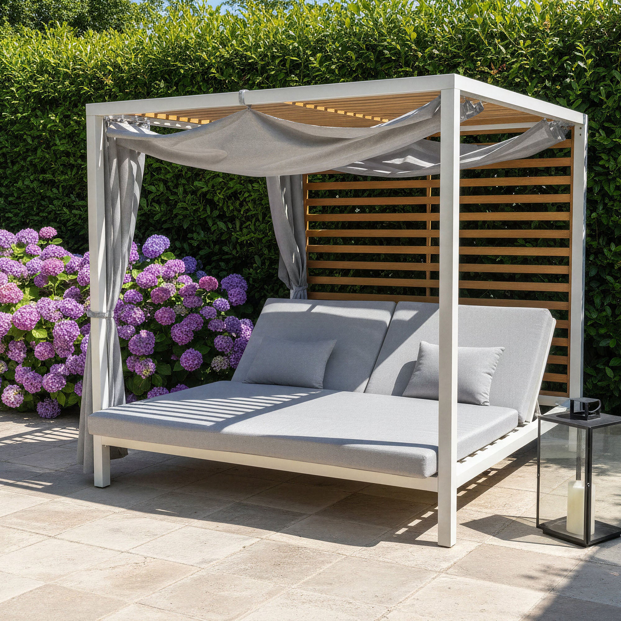 The April daybed is designed to offer a stylish and comfortable outdoor relaxation space. Its extruded aluminum frame ensures excellent durability without the risk of rust, while its opaque curtains provide privacy and protection so you can fully enjoy your moments of relaxation.