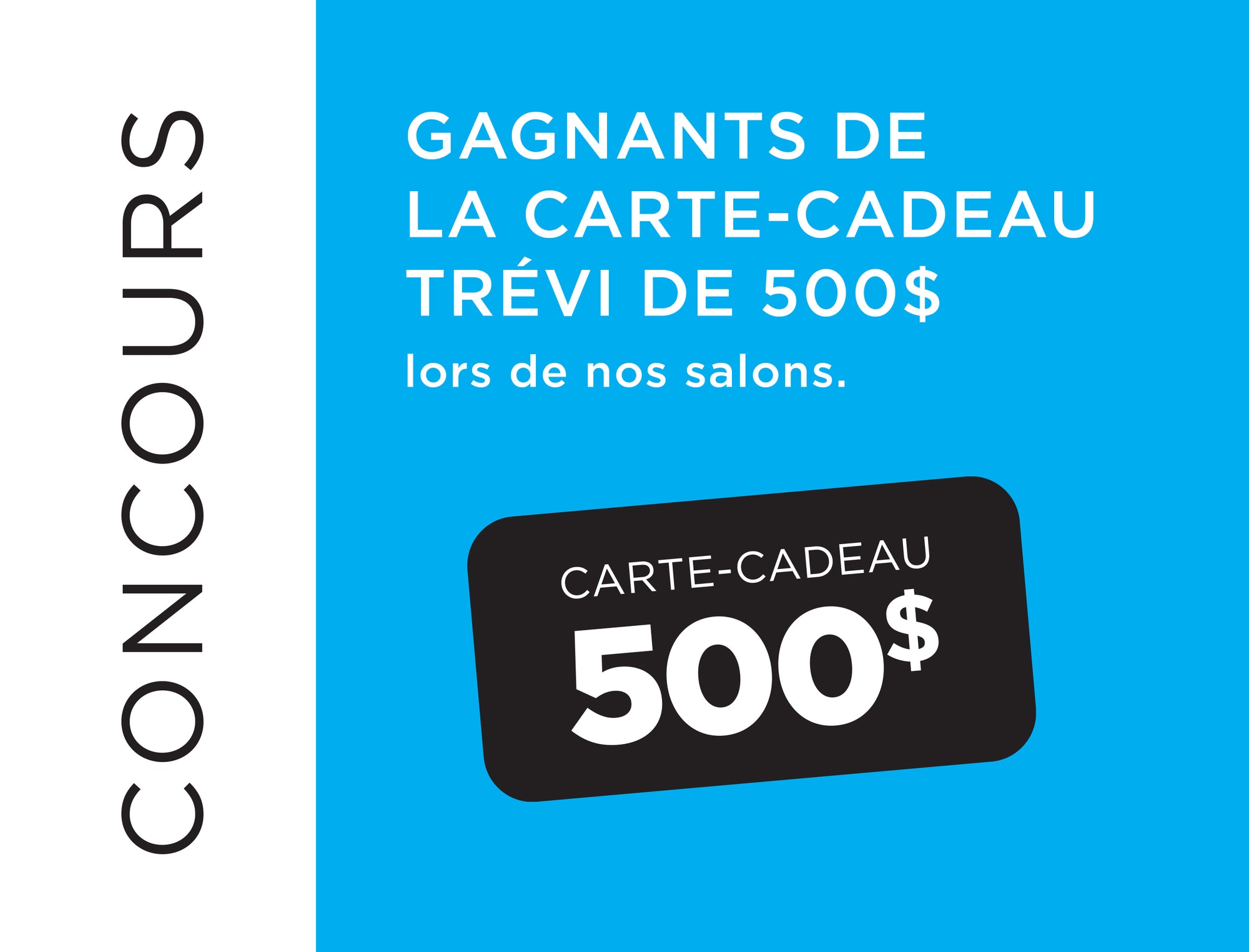 Trévi est fier d'avoir été à votre rencontre lors des derniers Salons à travers le Québec. Pour célébrer ces moments d'exception et vous aider à réaliser vos projets, nous avons offert la chance à nos visiteurs de remporter l'une des cartes-cadeaux Trévi d'une valeur de 500 $.