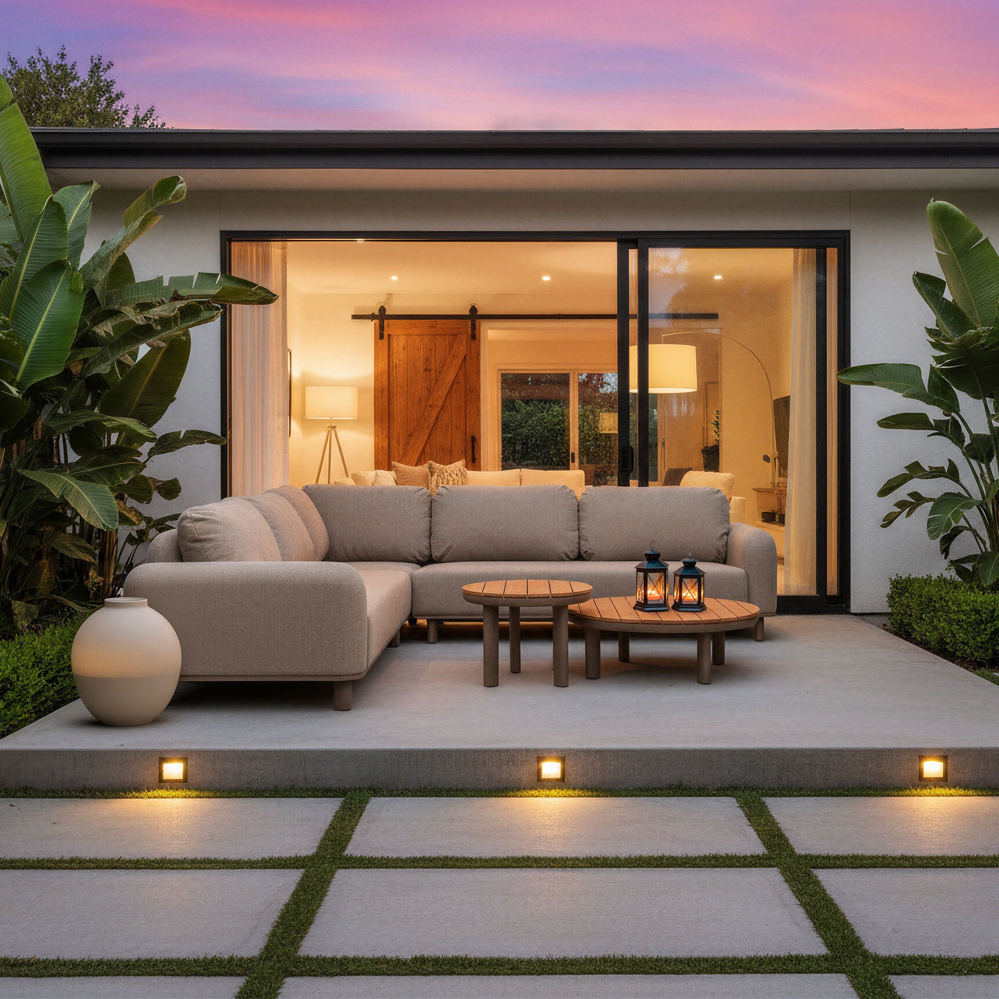 Priorité au confort, look d’intérieur avec la qualité des matériaux résistants aux intempéries, structure d’aluminium extrudé habillé d’épais coussins, assise semi-ferme et dossier moelleux, en Oléfine 100% bouclée avec ses qualités hydrofuge et sa résistance aux rayons UV.