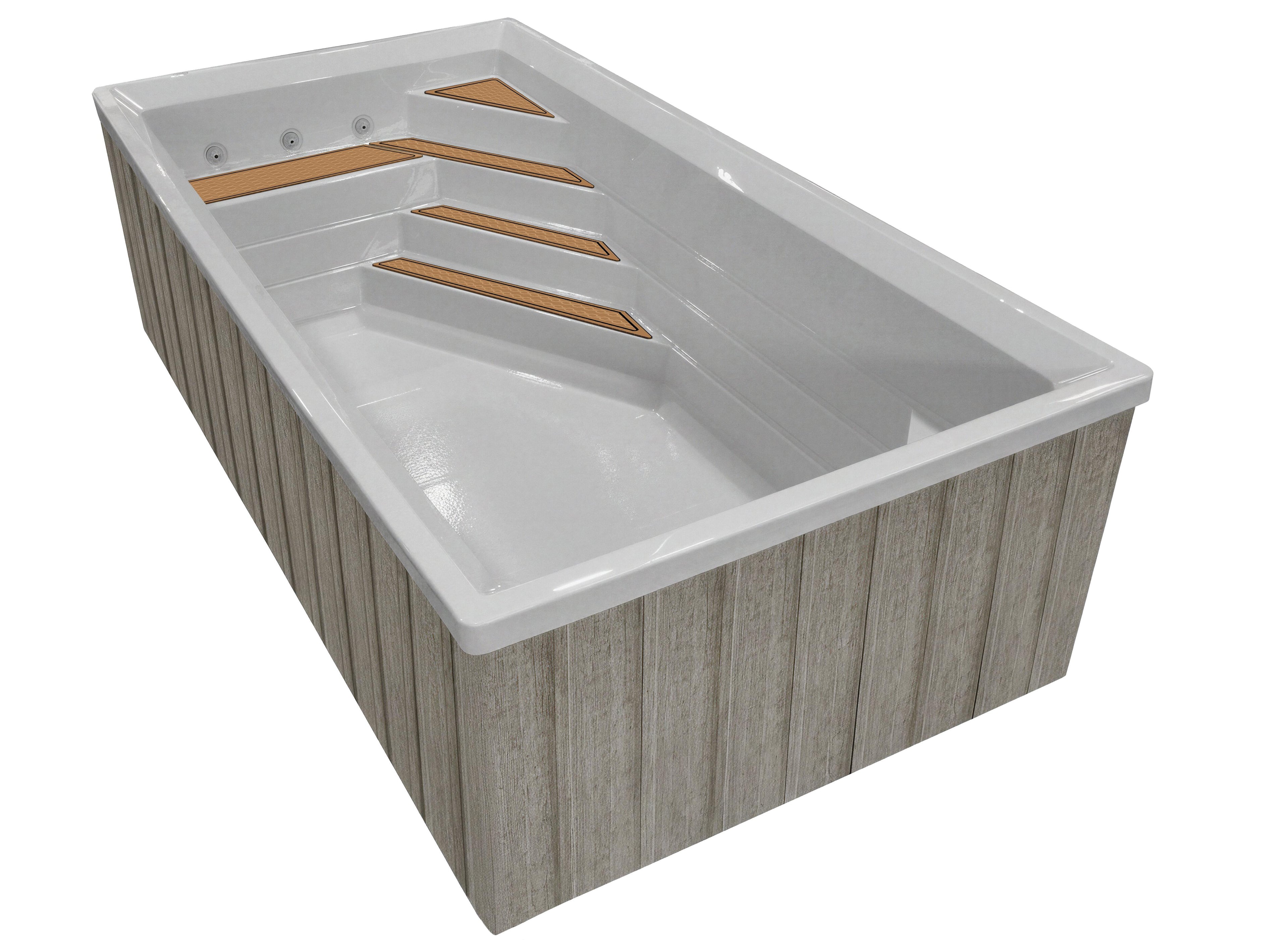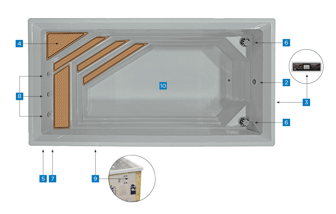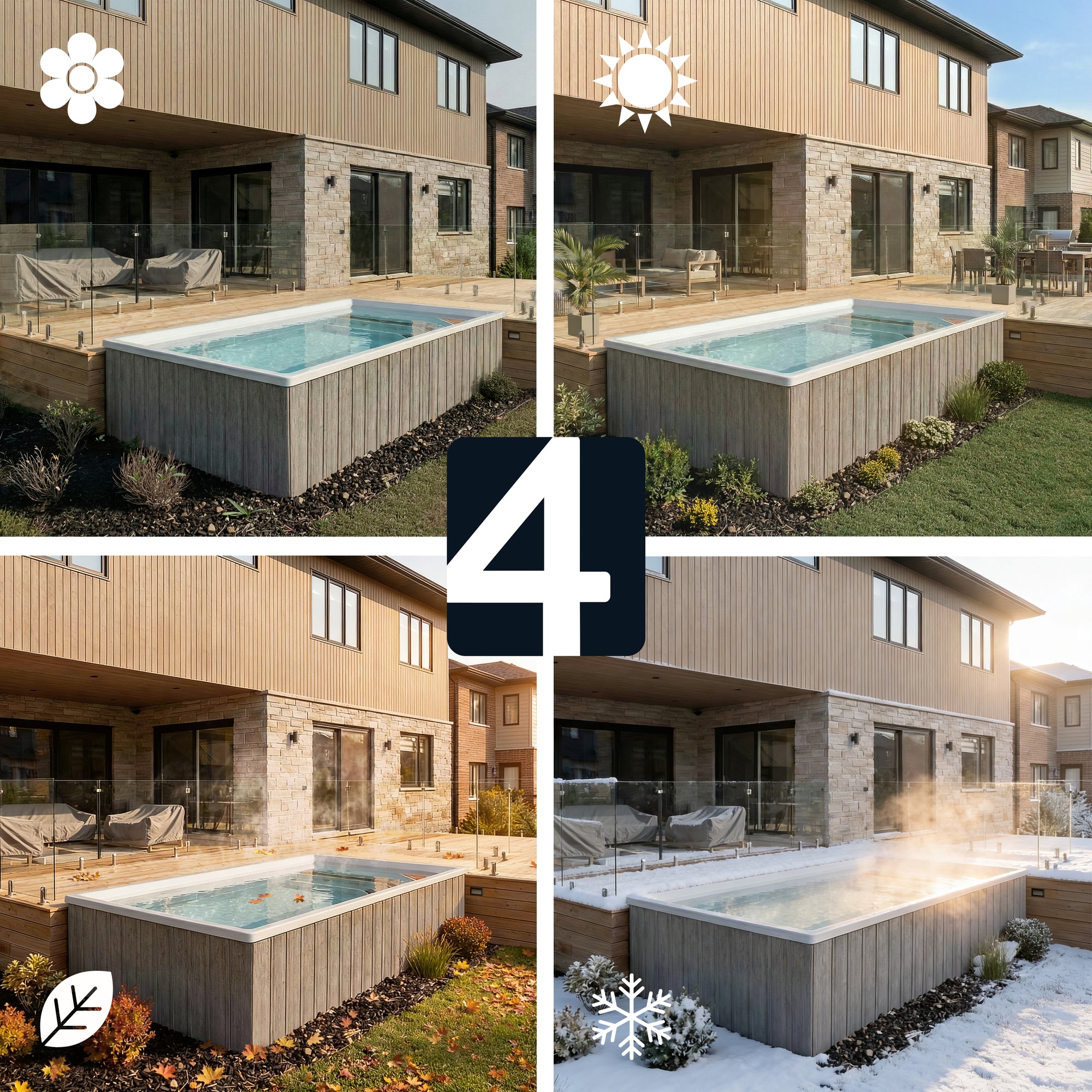 Conçue en acrylique et fibre de verre, la piscine Urbani4 intègre une isolation performante, incluant une chambre à air et l’isolation RMAX®, afin d’aider à conserver la chaleur et soutenir une utilisation quatre saisons. Les équipements, chauffe-eau électrique, filtration par cartouche et pompe à vitesse variable, sont soigneusement dissimulés sous la structure et bien isolés, pour un rendu propre et haut de gamme.