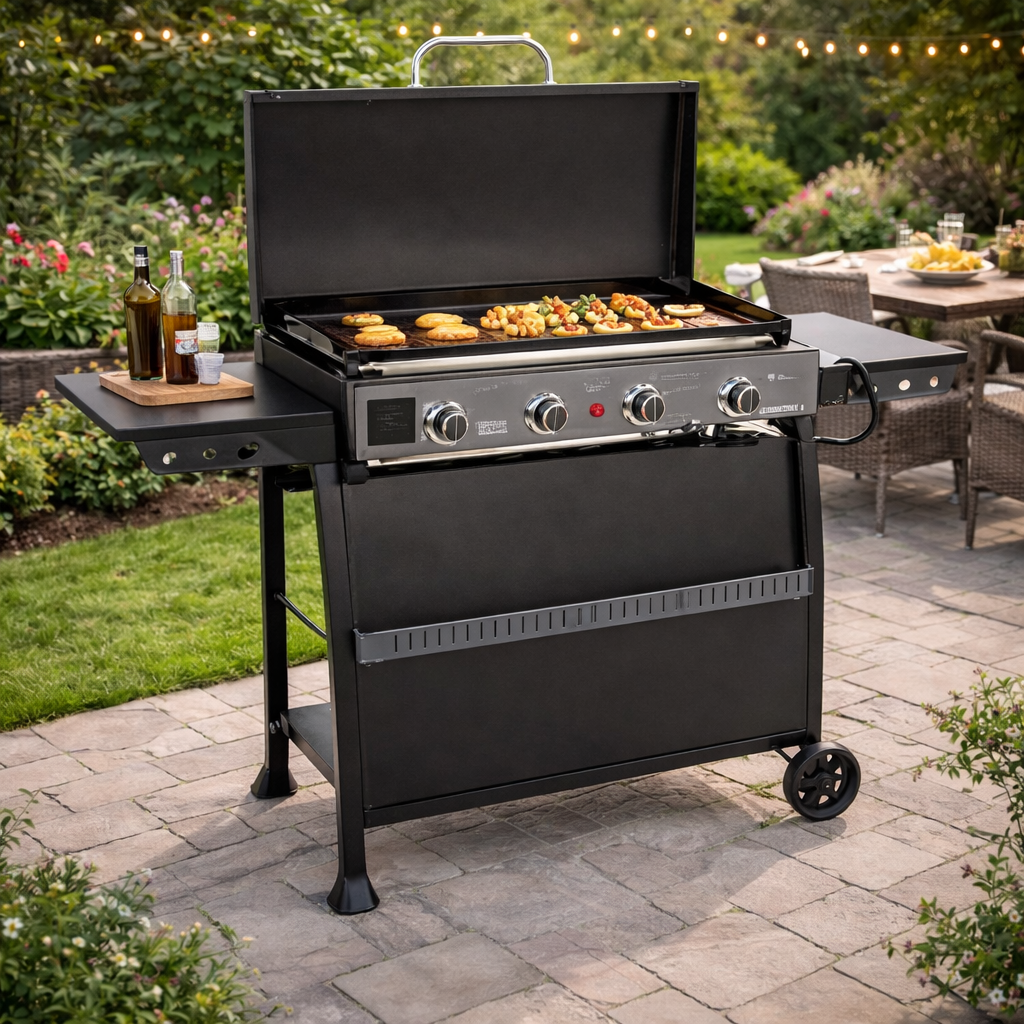 Plaque chauffante au gaz à 4 brûleurs offrant une surface de cuisson de 392 pouces carrés, avec couvercle.