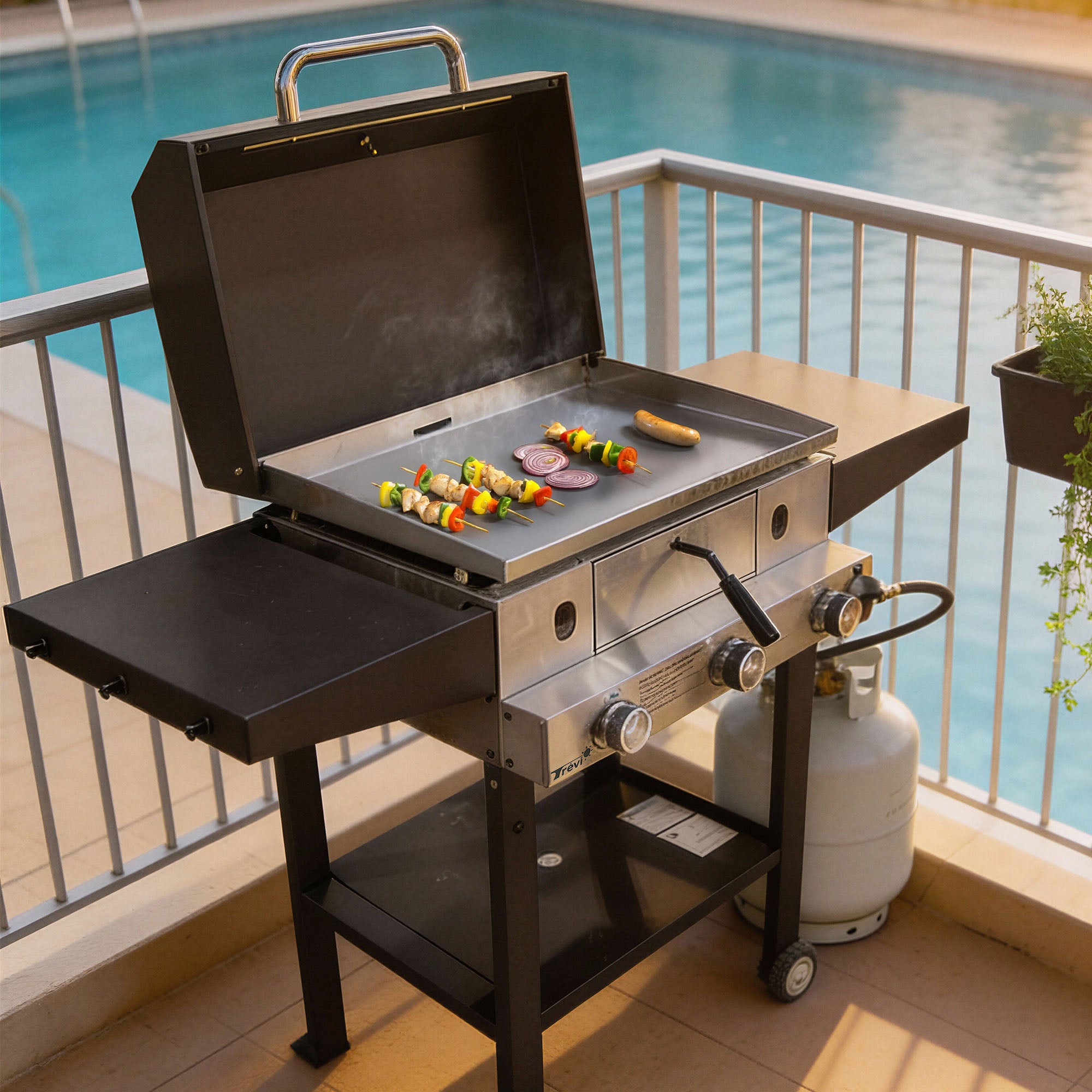 Avec la plaque chauffante 3 en 1 de Trévi vous pouvez tout faire : cuire, saisir, rôtir, sauter et frire à l'air et cuire votre meilleure pizza. Cette plaque chauffante en acier inoxydable 468 pouces carrés d'espace de cuisson se combine à un espace pour friture à l'air. Deux étagères latérales, avec crochets pour ustensiles,offrent un espace de préparation et de stockage précieux. Une hotte retient la chaleur et réduit les éclaboussures.
